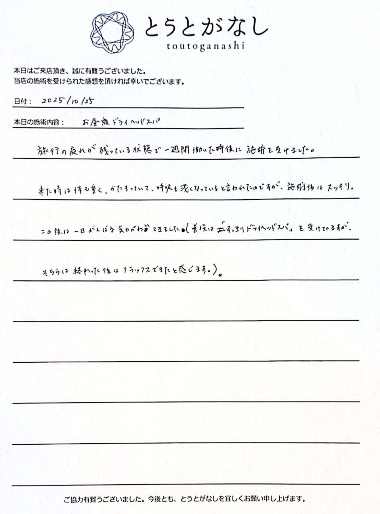 早速、おひるねドライヘッドスパを受けてくださった方の直筆のご感想をご紹介します。