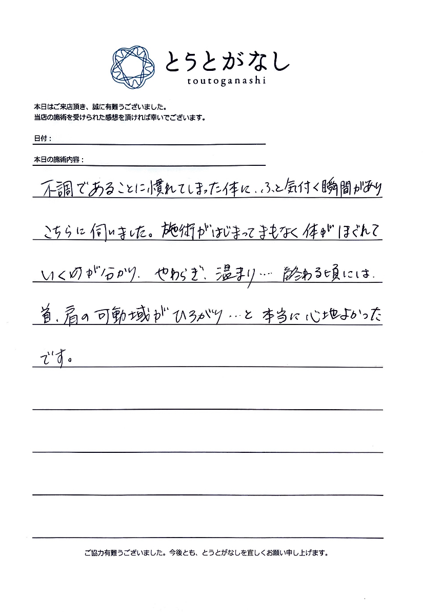 不調であることに慣れてしまった体に、ふと気づく瞬間があり、こちらに伺いました。 施術が始まってまもなく、体がほぐれていくのが分かり、やわらぎ、温まり…。 終わる頃には首・肩の可動域が広がっていて、本当に心地よかったです。